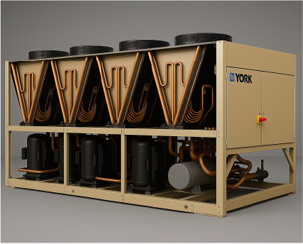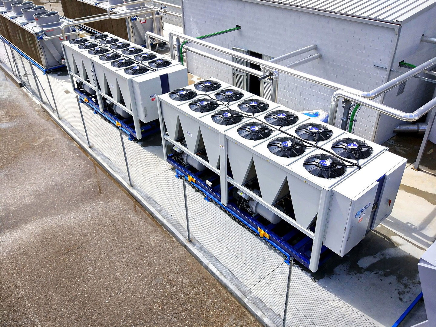 Aire acondicionado industrial chillers:Un aire acondicionado de tipo Chiller es una unidad enfriadora de líquidos. Su interior contiene un serpentín de cobre por donde circula el agua, y por medio de un ventilador silencioso, recircula el aire del ambiente. Uno de los principales ventajas es que se puede acumular agua fría en tanques, lo que asegura tener la capacidad necesaria en los momentos de mayor requerimiento.